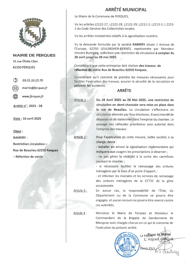 ARRÊTÉ RESTRICTION DE CIRCULATION RUE LOUIS LE SÉNÉCHAL : TRAVAUX D’ENFOUISSEMENT DE RÉSEAU EN CHAUSSÉE (DU 10 MARS AU 2 JUIN 2025)